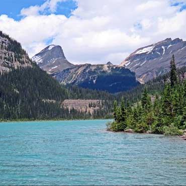 The trail head for Sherbrooke Lake in Yoho National Park begins just west of the Great Divide Lodge along the TransCanada Highway. You will travel through an old growth forest and part of an important wildlife corridor. This path has a consistent gentle ascent and crosses over the occasional plank bridge, eventually arriving at the very picturesque Sherbrooke Lake.